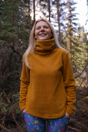 This cozy tunic has long sleeves, a tall cowl neck and a scooped hem that covers your hips. It makes an excellent base layer and the cowl neck functions as a built-in neck gaiter! True to size.